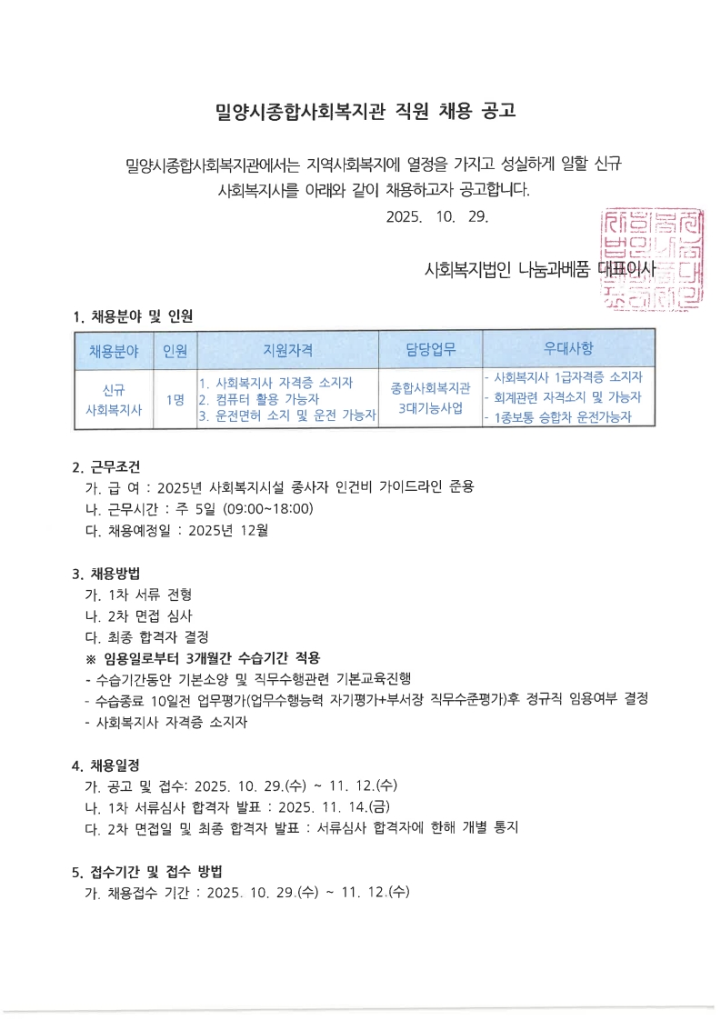 2025년 밀양시종합사회복지관 사회복지사 채용 공고