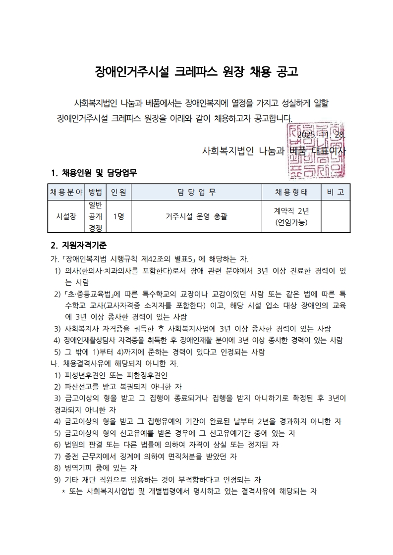 장애인거주시설 크레파스 원장 채용 공고