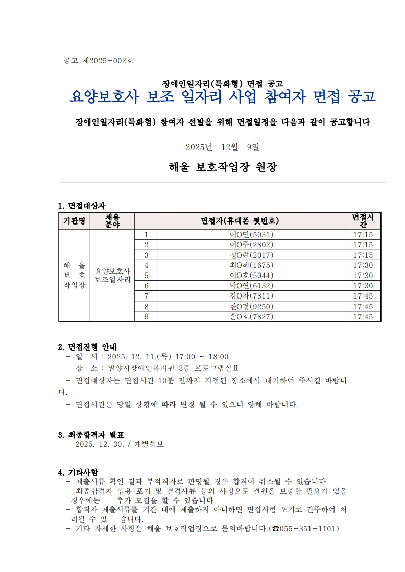 요양보호사 보조 일자리 사업 참여자 면접 공고