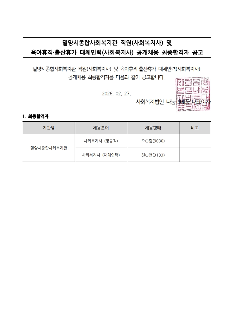 밀양시종합사회복지관 직원(사회복지사) 및 육아휴직·공개채용 최종합격자 공고