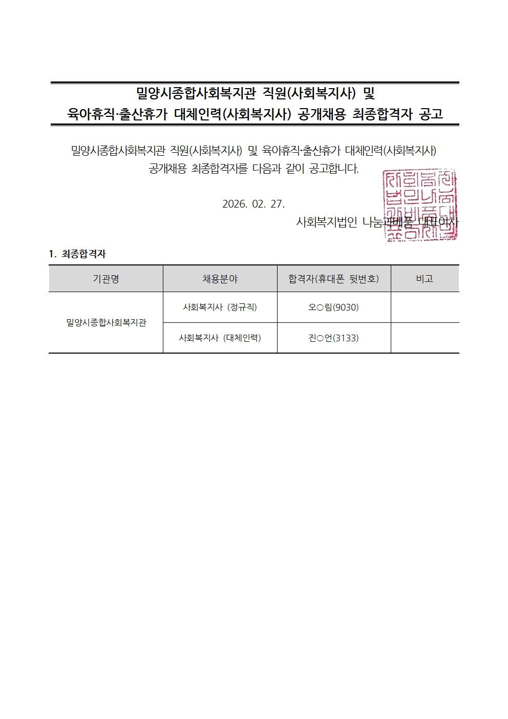 밀양시종합사회복지관 직원(사회복지사) 및 육아휴직·공개채용 최종합격자 공고